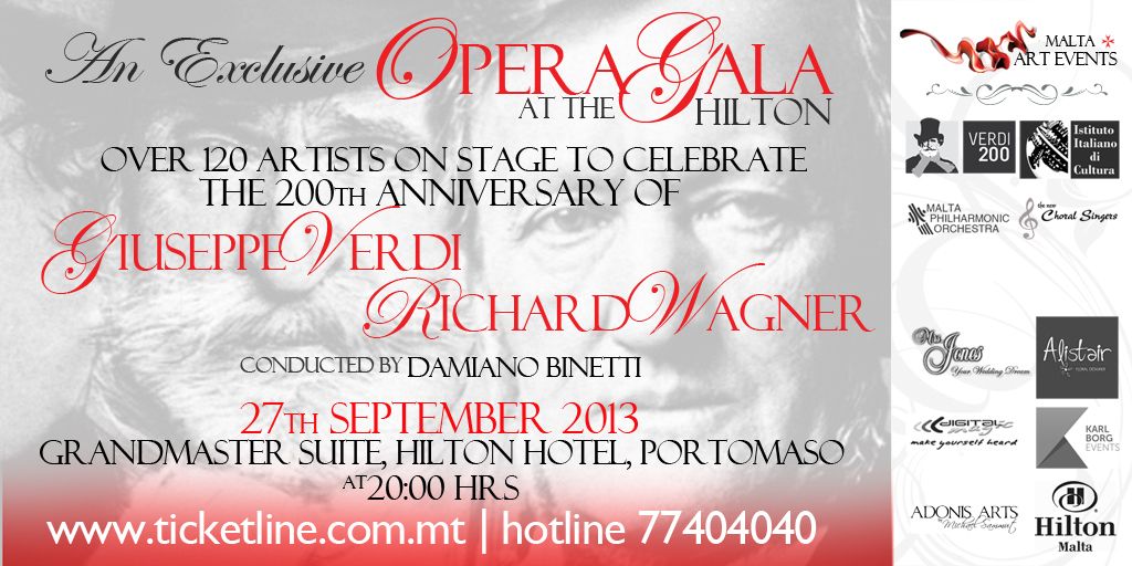This OPERA GALA is being organized to celebrate the 200th anniversary of Verdi and Wagner, through a lyric-symphonic concert at Hilton Hotel Portomaso, with the Malta Philharmonic Orchestra, Maltese and international soloist conducted by the acclaimed Italian Maestro Damiano Binetti. The famous two composers of the 19th century opera music, icons of their nations during turbulent era were fundamentally opposite from other another. However, the two have managed to use theatre and music to join societies together.