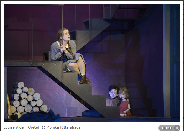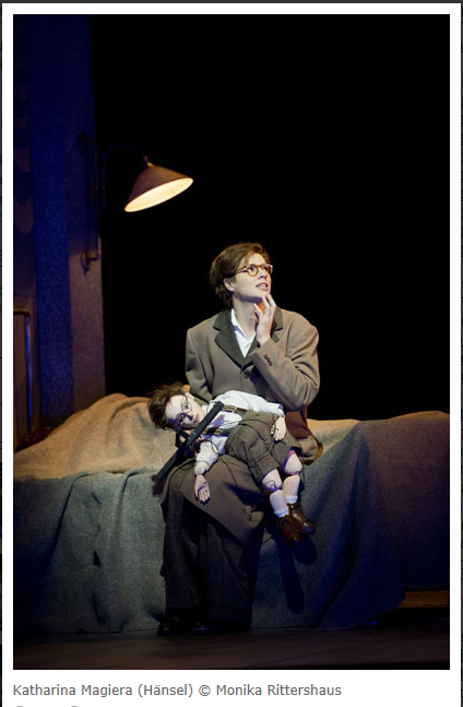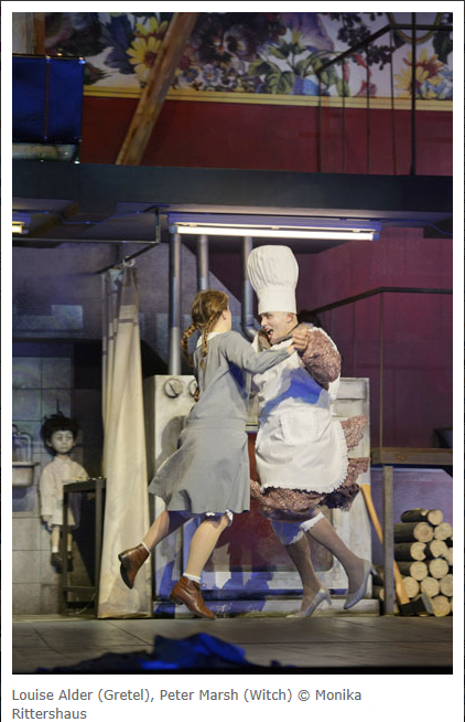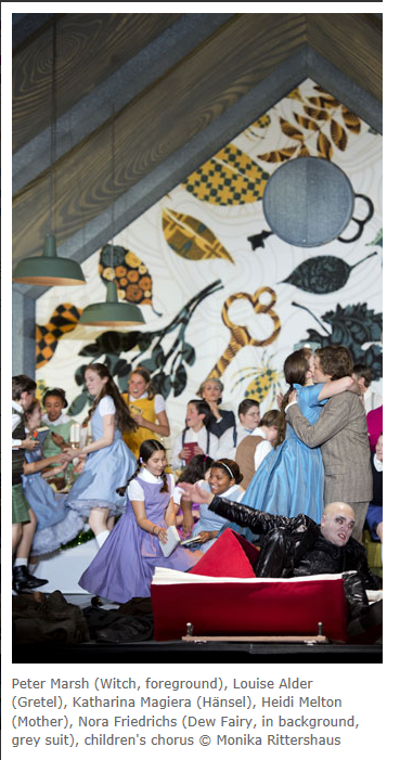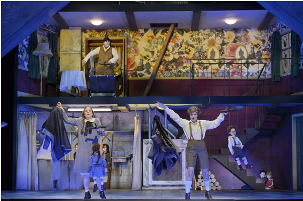Katharina Magiera (Hänsel) Louise Alder (Gretel), Elizabeth Reiter (Sandman, centre), © Monika Rittershaus