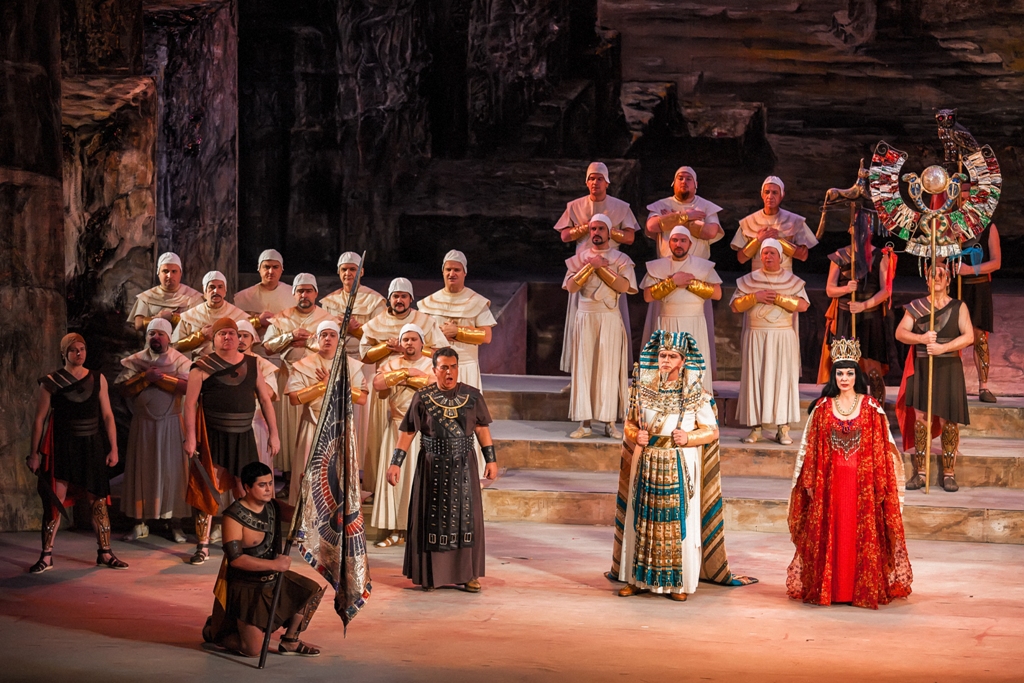 Radamès returns victorious and the troops march into the city. The Egyptian king decrees that on this day the triumphant Radamès may have anything he wishes. The Nubian captives are rounded up, and Amonasro appears among them. Aida immediately rushes to her father, but their true identities are still unknown to the Egyptians, save for the fact that they are father and daughter. Amonasro declares that the Nubian king (he himself) has been slain in battle. Aida, Amonasro, and the captured Ethiopians plead with the Egyptian King for mercy, but the Egyptians call for their death. Claiming the reward promised by the King, Radamès pleads with him to spare the lives of the prisoners and to set them free. Gratefully, the King of Egypt declares Radamès to be his successor and to be his daughter’s betrothed. Aida and Amonasro remain as hostages to ensure that the Ethiopians do not avenge their defeat.