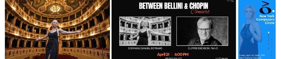 The other dates: April 30 in Milwaukee and May 1 in Stevens Point, Wisconsin; on May 8 in Corpus Christi, Texas; on May 15 in Toledo, Ohio; the last stop will be in Buffalo, New York. To learn more, the Bellini and Chopin project — Two geniuses compared, born between 2013 and 2014, has been presented in Mexico, the United States, Italy, and China. Much appreciated by the public is this combination, which leads to rediscovering sides that are sometimes little-known or unfamiliar to many. In 2018, Dominika Zamara recorded the entire cycle of Chopin’s Lieder in the original keys, with a performance at the Accademia del Teatro alla Scala in Milan. A copy of this recording is preserved in the library of the Academy itself.